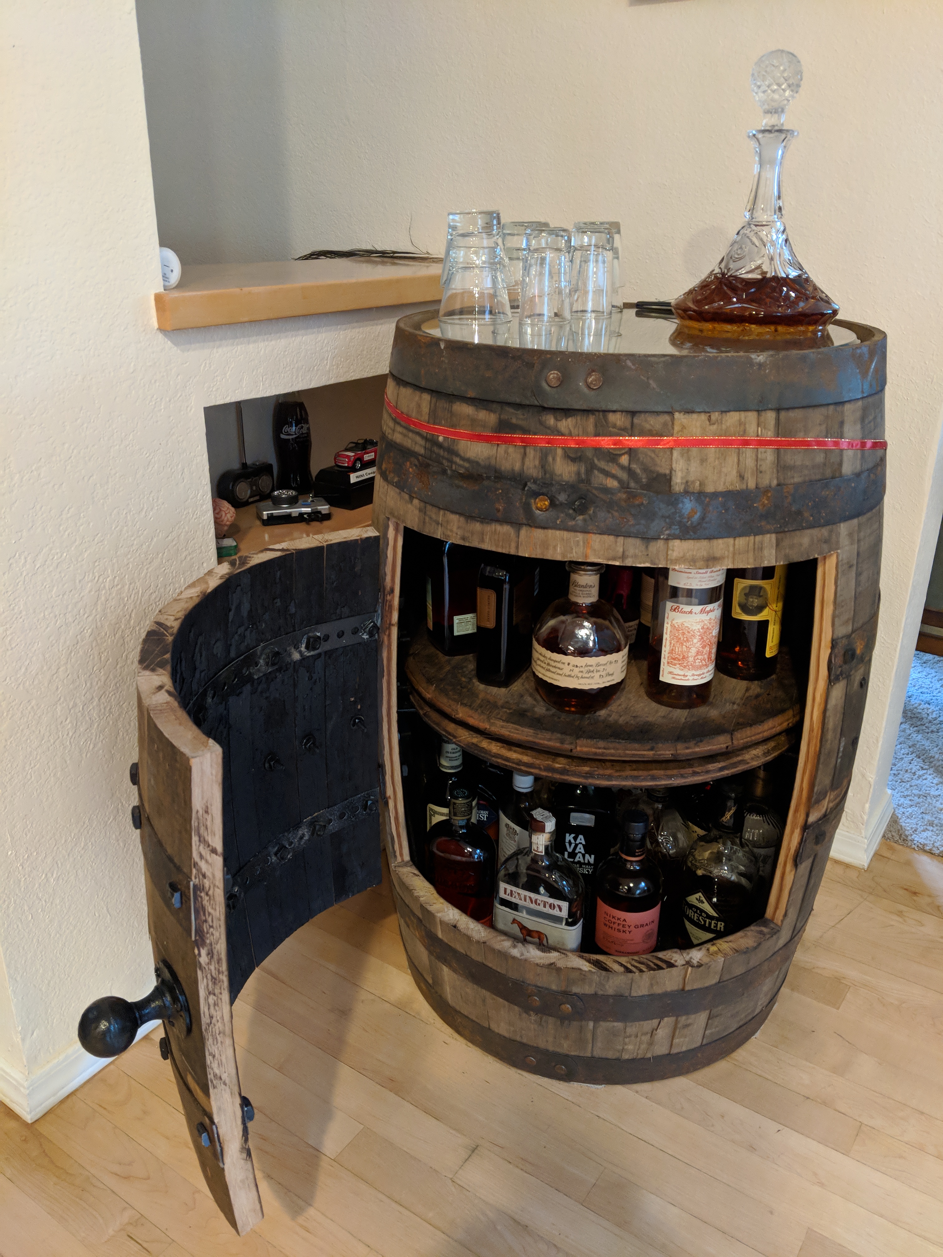 Wow, I forgot to include the bourbon barrel liquor cabinet on the carpentry page. Egads, such an oversight! It’s there now along with a link to the build history.