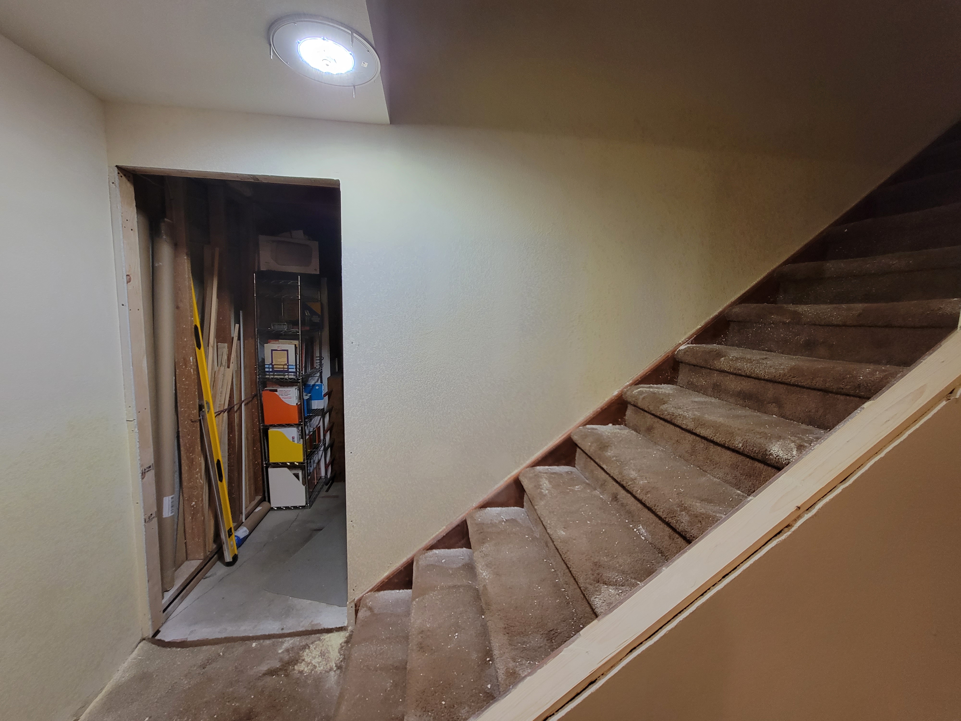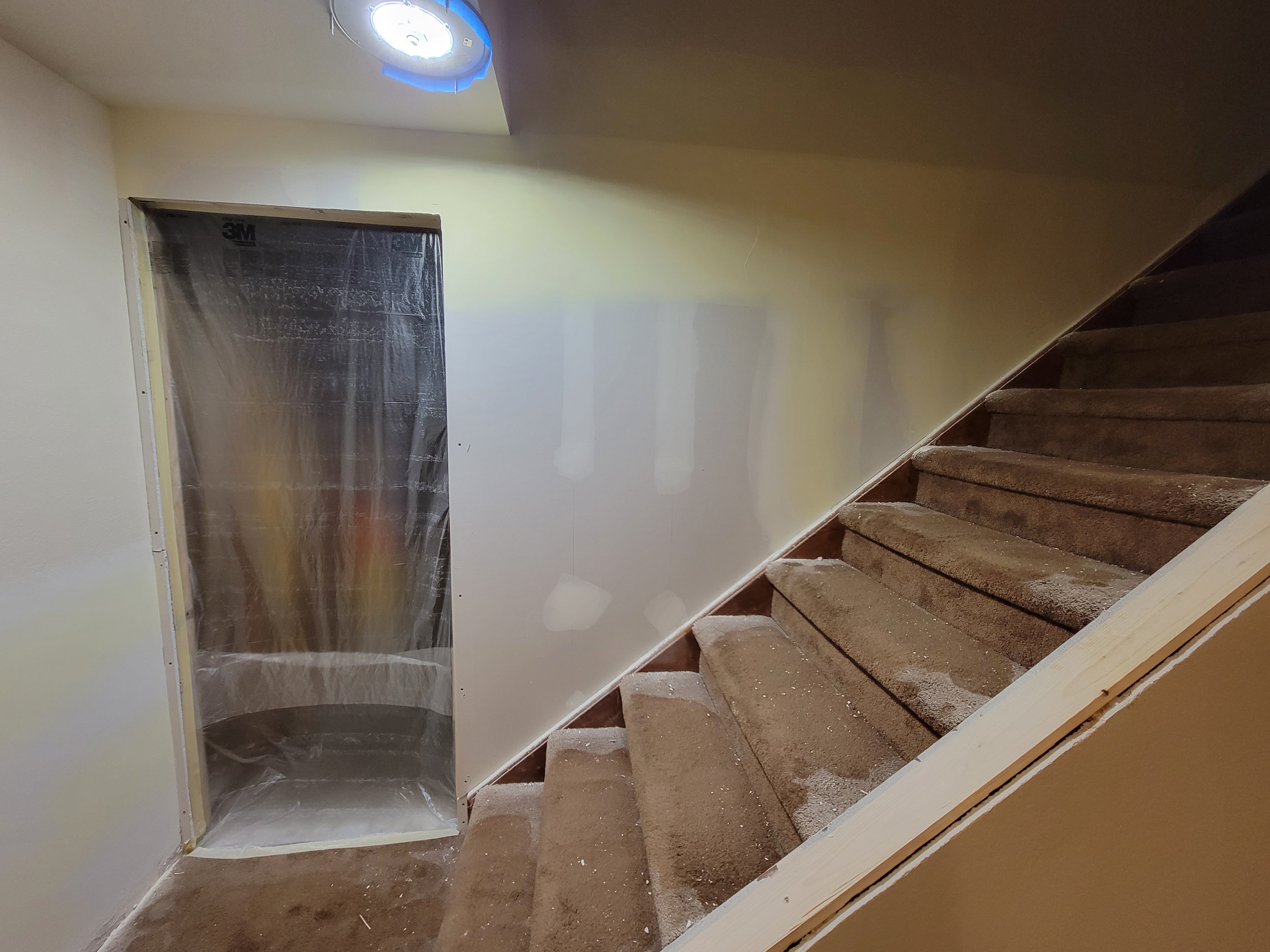 The contractors were a lot quicker than me too: They prepped, applied mud, sanded, and textured over three half-days. The basement (and stairs) look great; paint will begin as soon as I install 200 linear feet of baseboard.