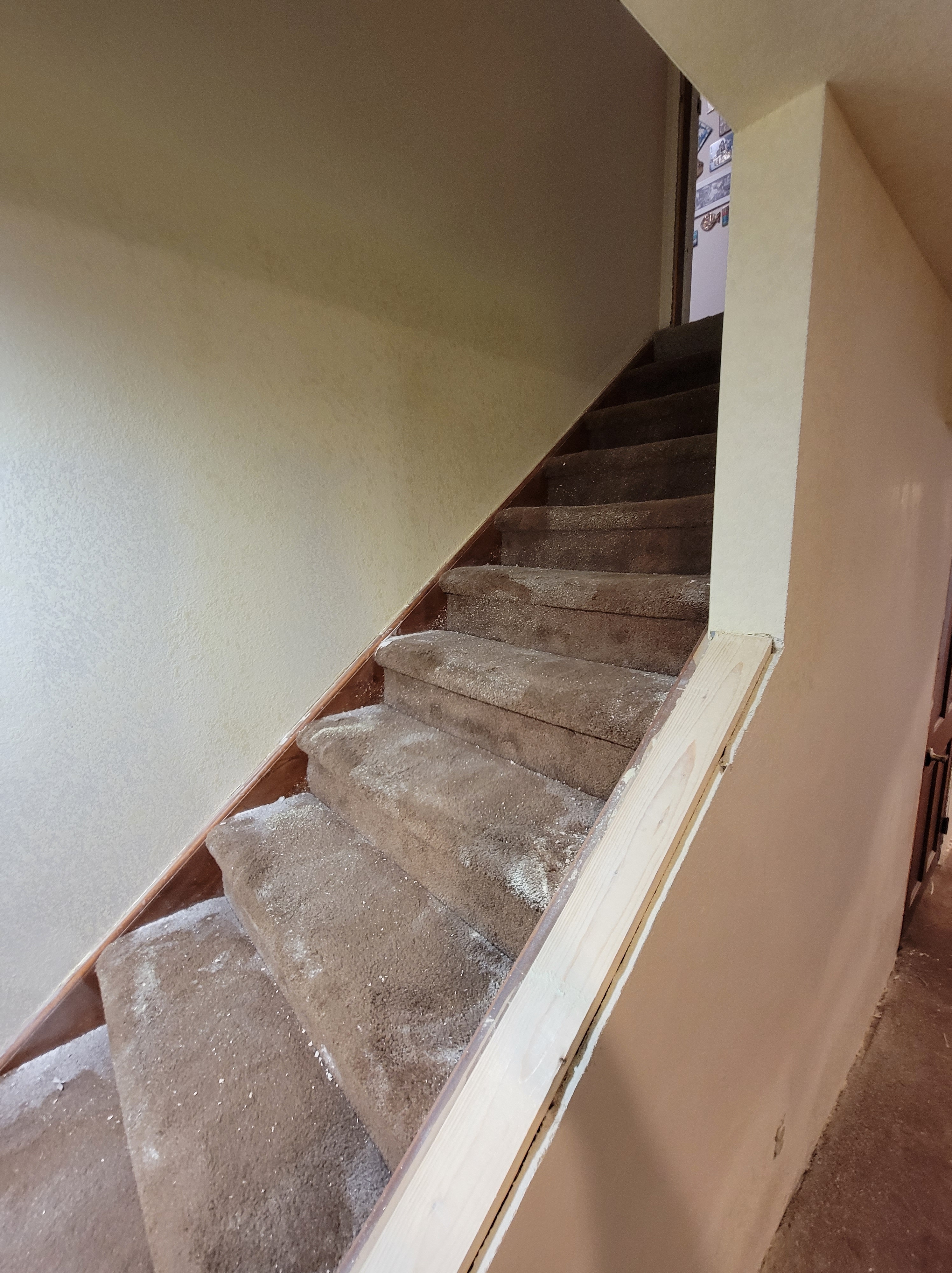 “A man has gotta know his limitations”. Well, perhaps not limitations, but certainly where time is better spent. Thus I hired a pair of amazing drywall experts to mud and texture the sheets of drywall I hung along the stairs. I’ve done smaller sections in the past, but not with new outer corner beads and this much surface area (I’m also refreshing most of the basement with repaired drywall, paint, new baseboard, and carpet).