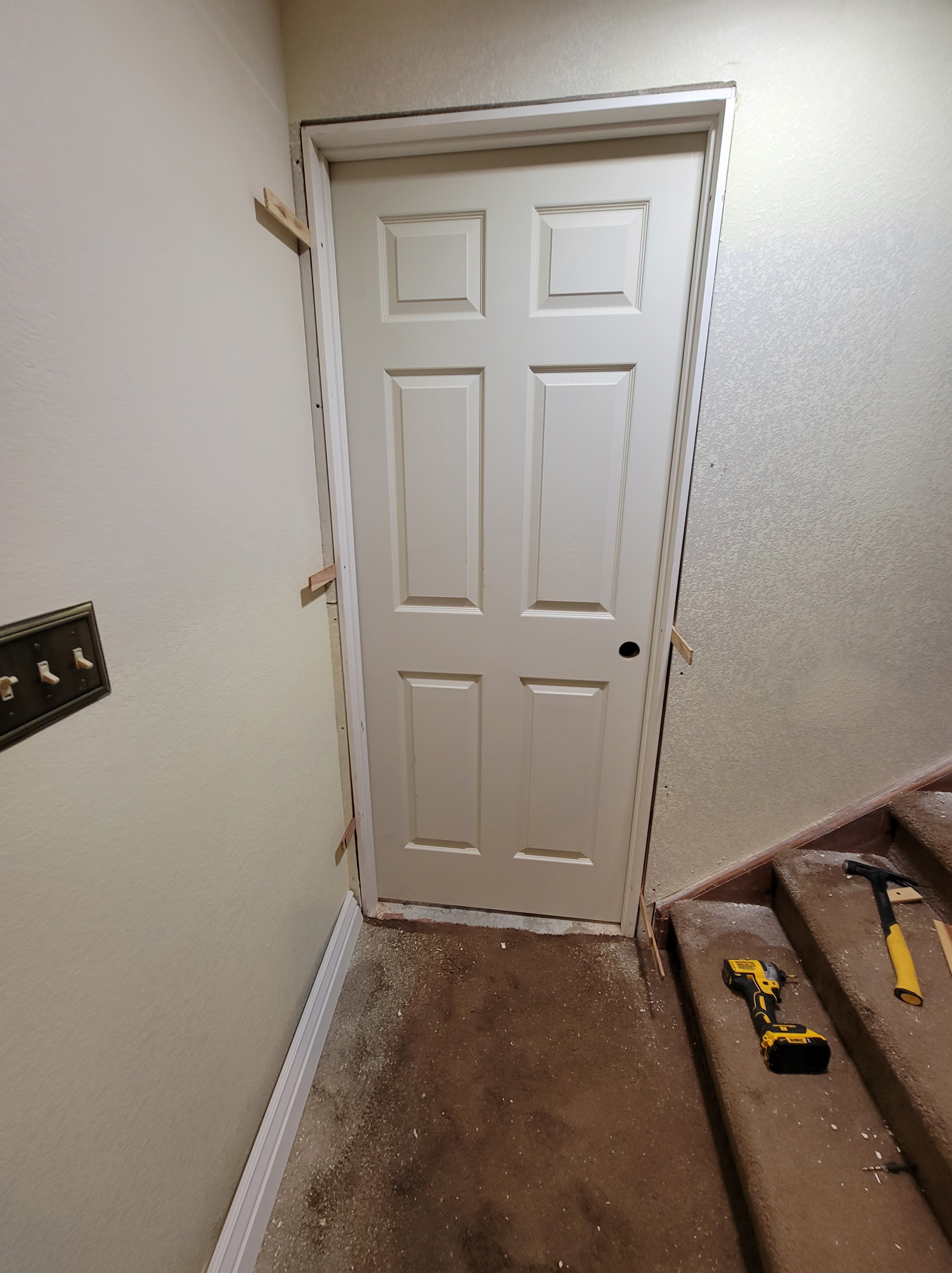 The new wall at the base of the steps includes a new prehung door for entry into the unfinished basement area (aka, my workshop). I framed for the door in “Part 3“; unfortunately I didn’t measure correctly and I almost had a lot more work on my hands! But more on that below…. 😉