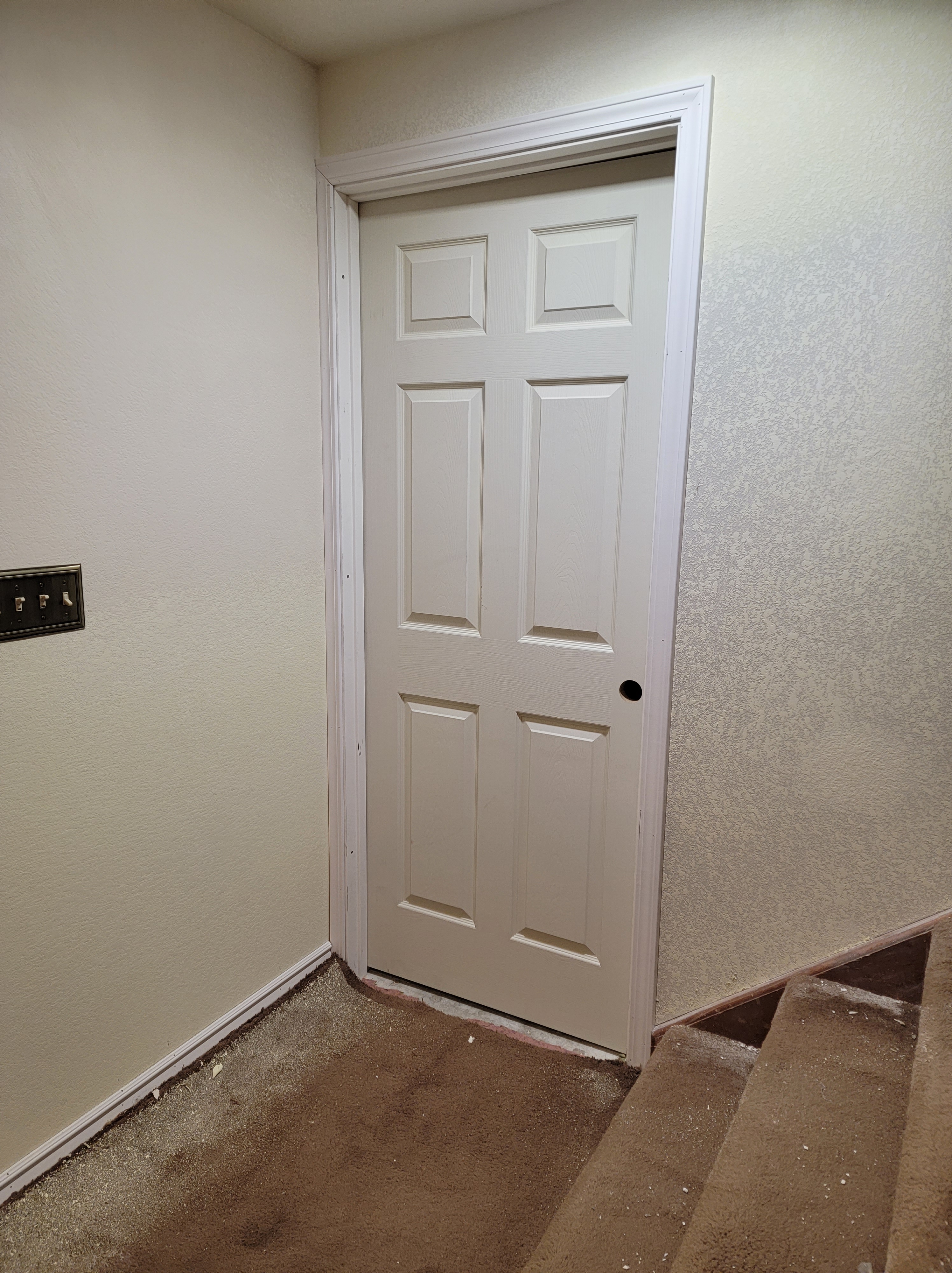 Baseboards: I’m adding baseboards to the entire basement. Why? The previous owner carpeted the lower few inches of the walls AND installed baseboards above that. It truly was wall-to-wall carpet! Baseboard installation was tricky since the pending new carpet requires 3/8″ gap for the carpet. I didn’t sweat perfect miters: the walls are uneven from top-to-bottom at at the angles (experience shows caulk solves all). Thus: