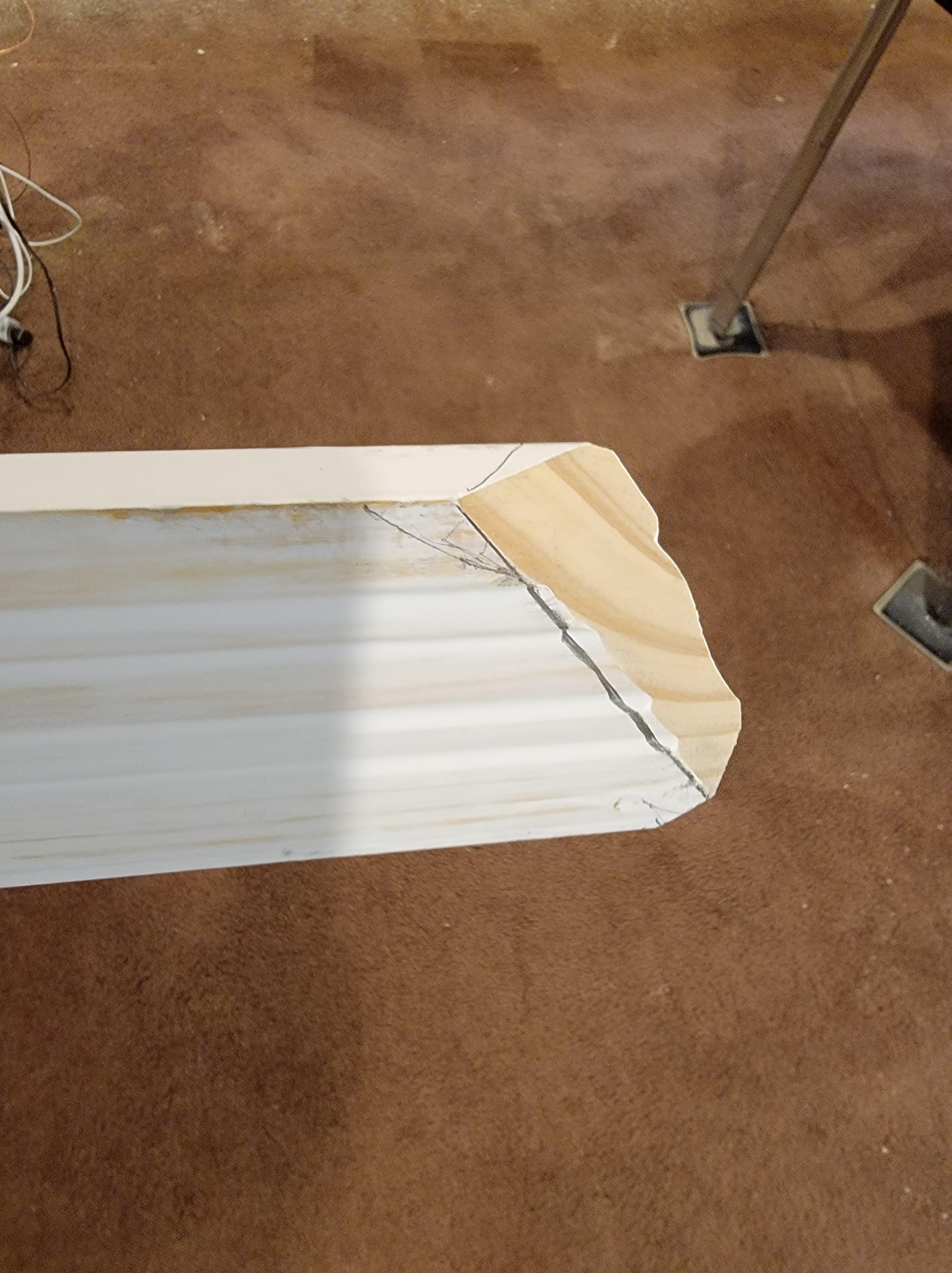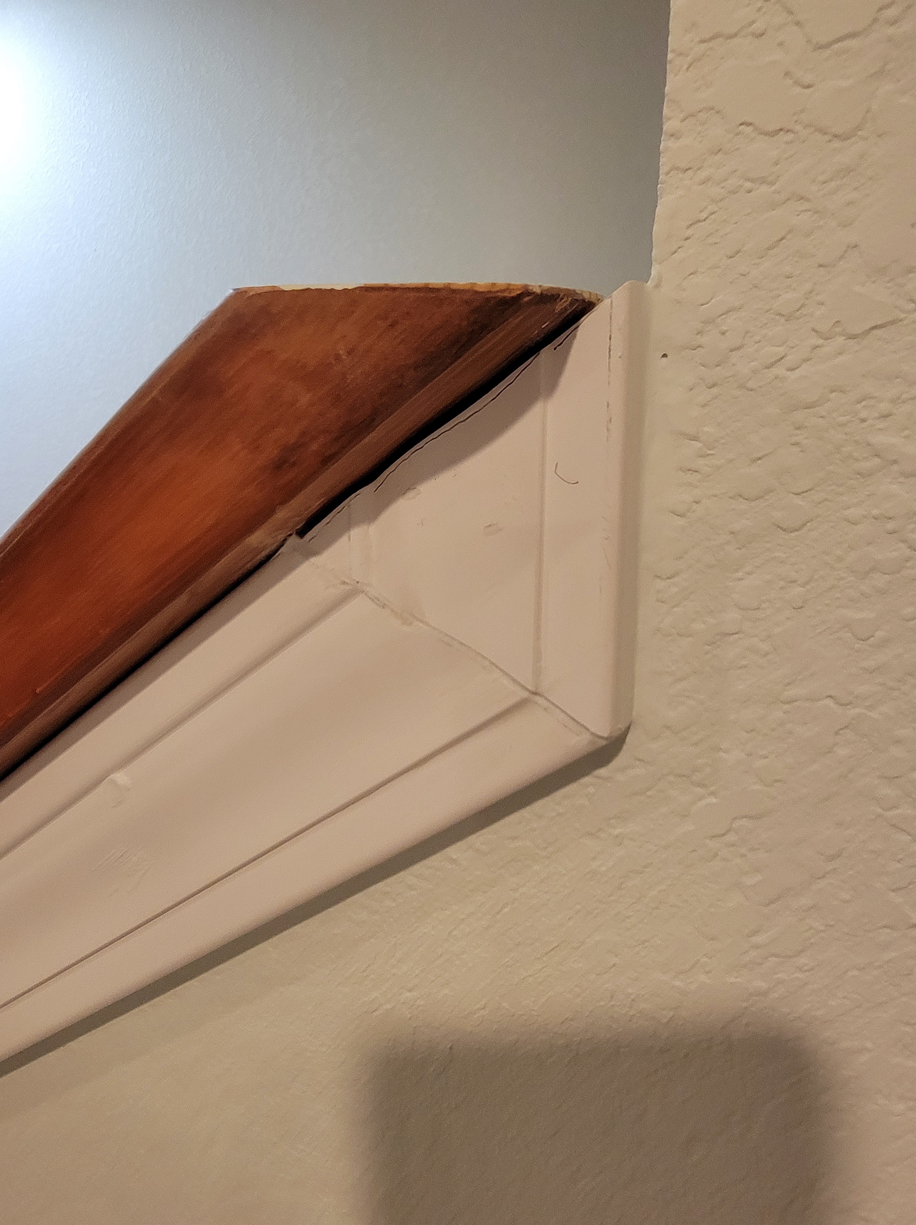 - Bottom: I held the molding in place and drew a line at the wall corner. I adjusted the miter saw for that angle, then tilted at 45-degrees for the outer miter. Thus a fancy miter double-cut that worked perfectly (photo below).