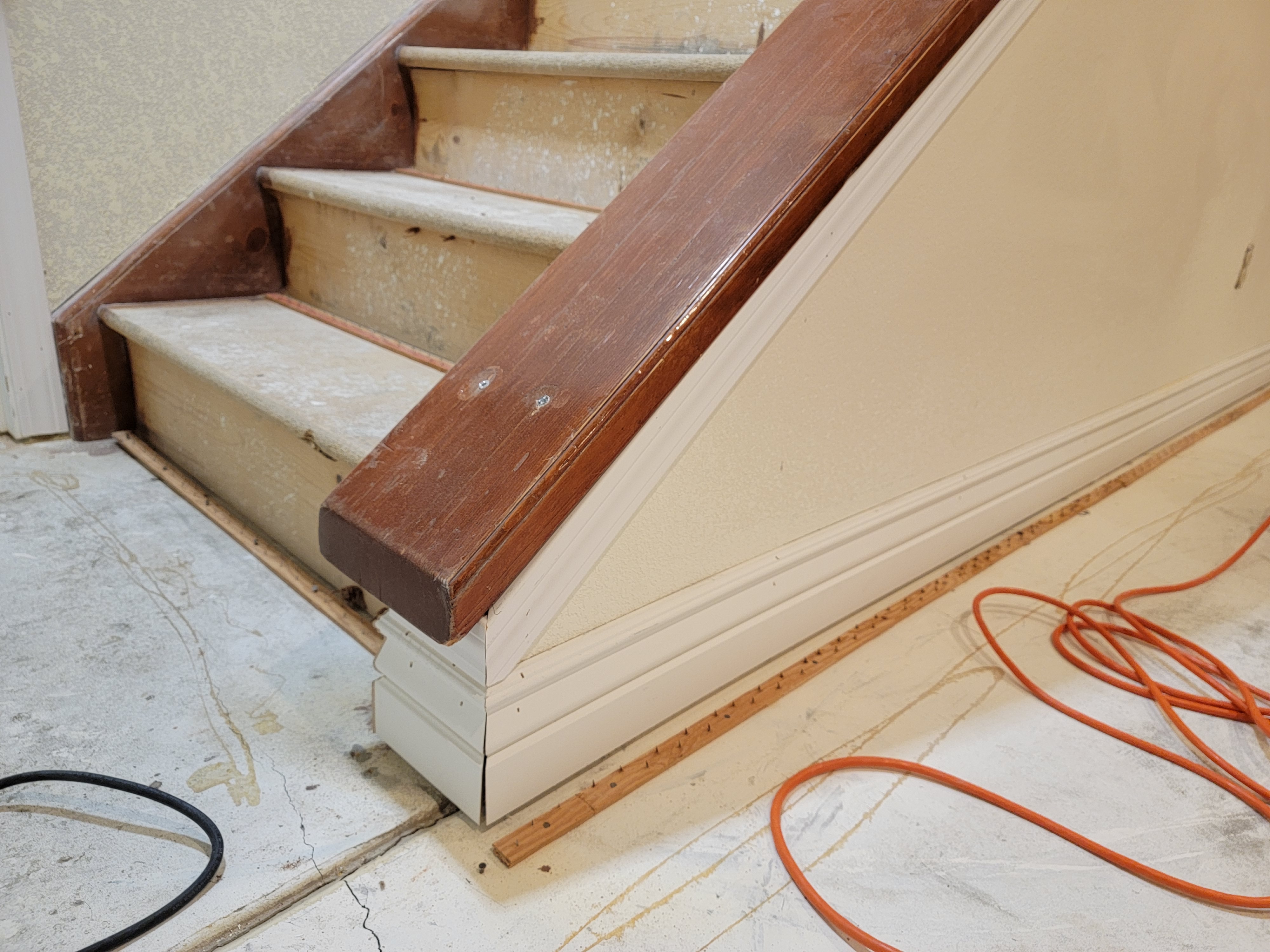 Casings: I placed 2 1/4″ casings around the doorways and below the temporary top-board on the shorter stair wall. Again, I wasn’t going for a perfect fit since these will be caulked and painted. Steps: