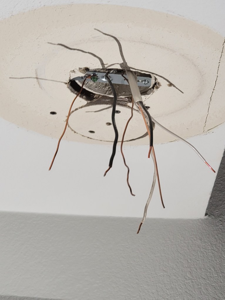 I removed the lower, existing ceiling light and used my hole-saw to cut away a 4″ round section of ceiling drywall adjacent to the junction box. I made sure it fit within the clearly visible light perimeter so it would be hidden once the light was re-installed.
