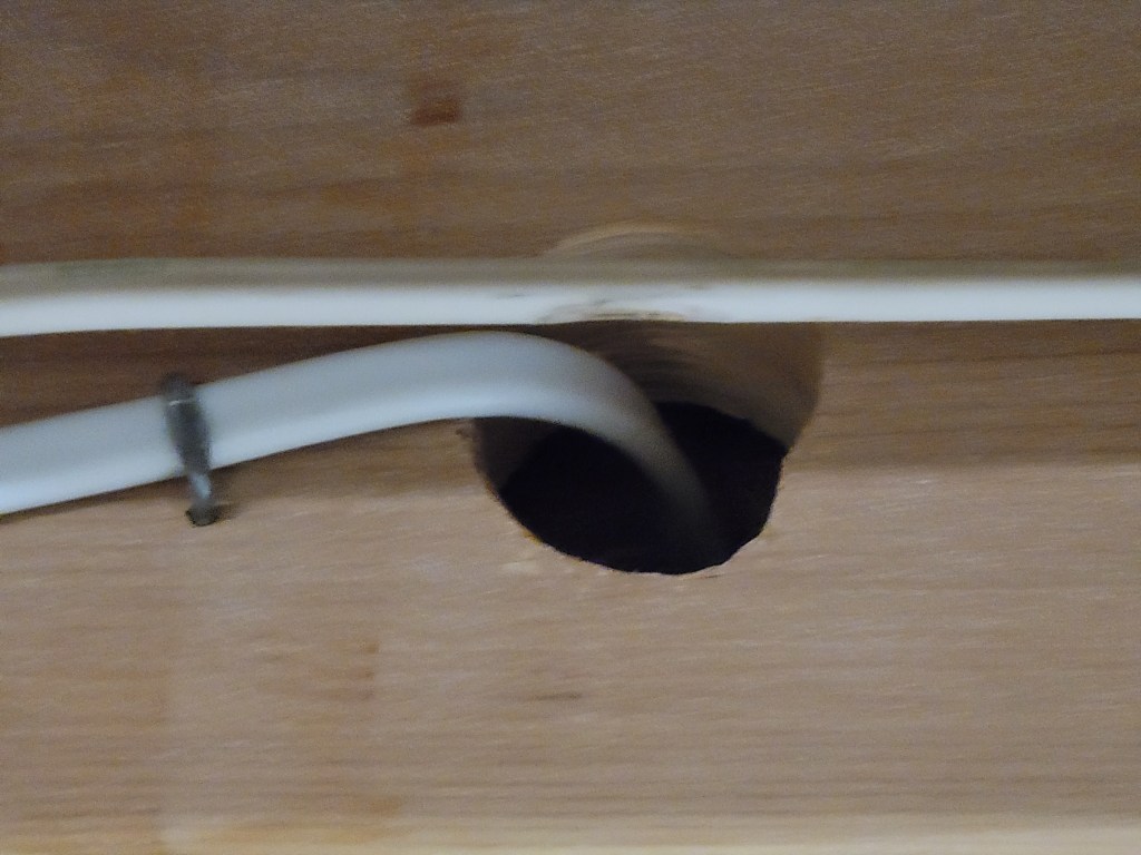 For the lower horizontal hole I drilled through the first set of double-joists (shown here after wiring), but my 17 1/2″ bit was still too short to reach the second joist. No worries, I had a plan. 🙂