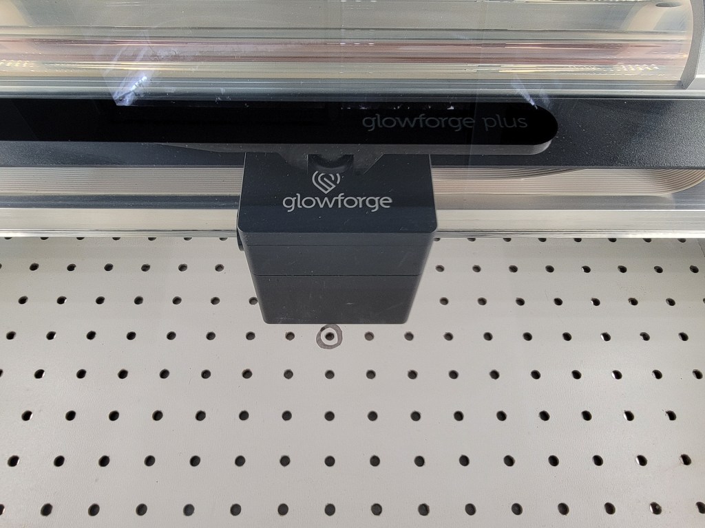Thicker objects require removal of the Glowforge’s “crumb tray” to make room under the laser head. But what then? Yes, you can place objects directly on the glowforge’s metal “floor”, but that by itself doesn’t accommodate easy object alignment or provide an indicator for where the lid camera position is (to lessen oblique angles).
