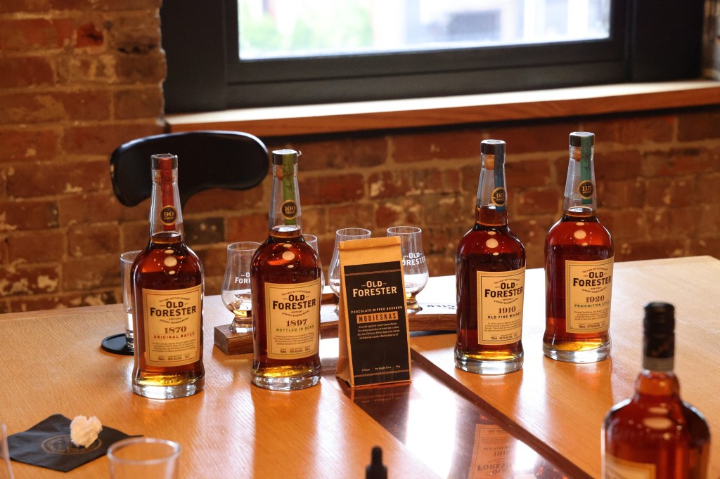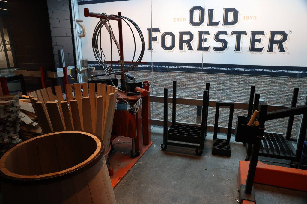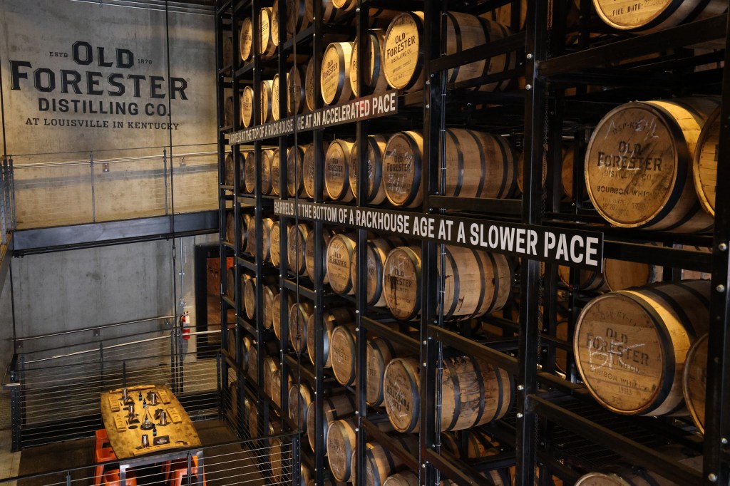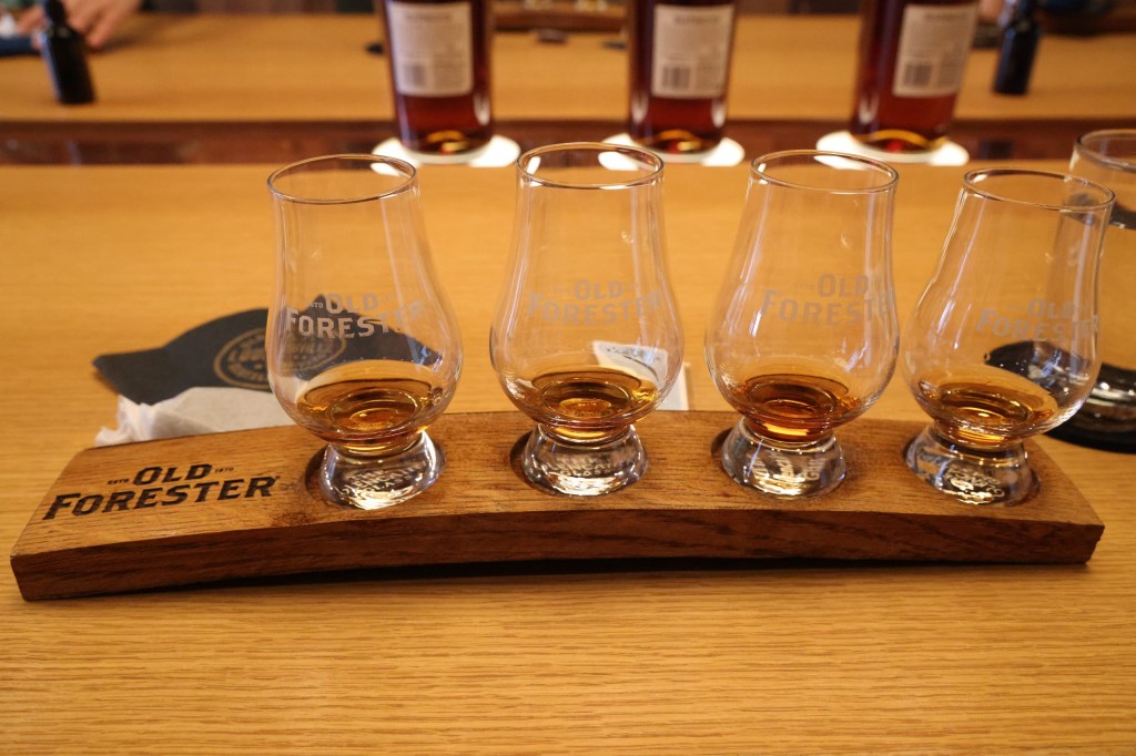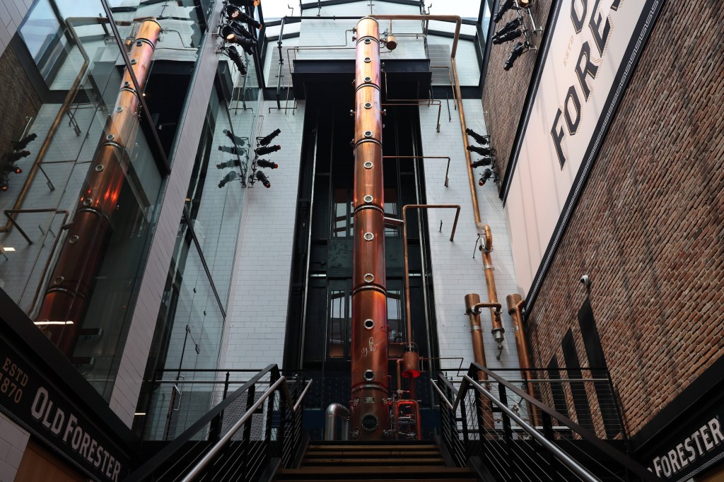 - Main St. produces a sizable amount of Old Forester’s products (blended with the whiskies produced at the larger Brown-Forman distillery in Shively). It’s more than a tourist attraction yet it still manages to feel touristy. The distillation column is displayed like the Alpha-Omega Bomb in Beneath the Planet of the Apes. The in-house cooperage is a nice display but not built for volume. And the “rickhouse” is labeled as a “rackhouse” since it’s a climate controlled warehouse that stores barrels on spiral of rails enclosing VIP tasting areas. Their ‘Birthday Bourbon’ was being bottled during our tour; the odd-shaped beautiful bottles required a bottling line retooling (which may explain why they were bottling regular Old Forester at the Woodford Reserve distillery in Versailles when we were there). Our tasting was excellent, however: 1870, 1897, 1910, and 1920. I always wanted to learn the differences and this tour answered my questions (I preferred the double-oaked 1910).