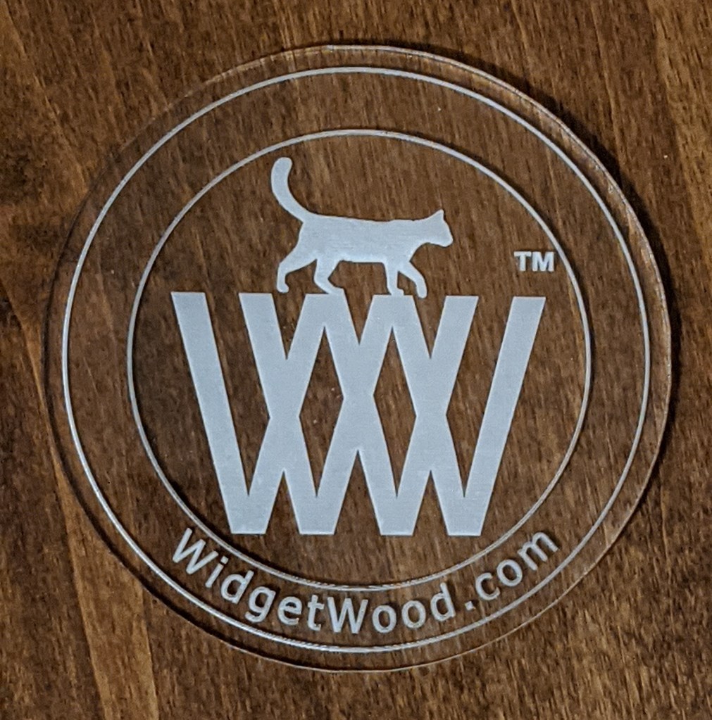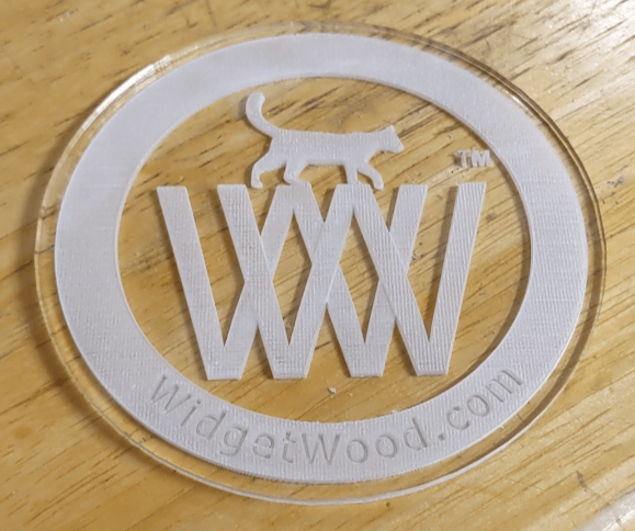 This is the second attempt at an acrylic coaster. The first included a filled band where the “widgetwood.com” text lives, and the result was a dark band and nearly impossible text. I modified the logo to remove the color band within the outer circle.