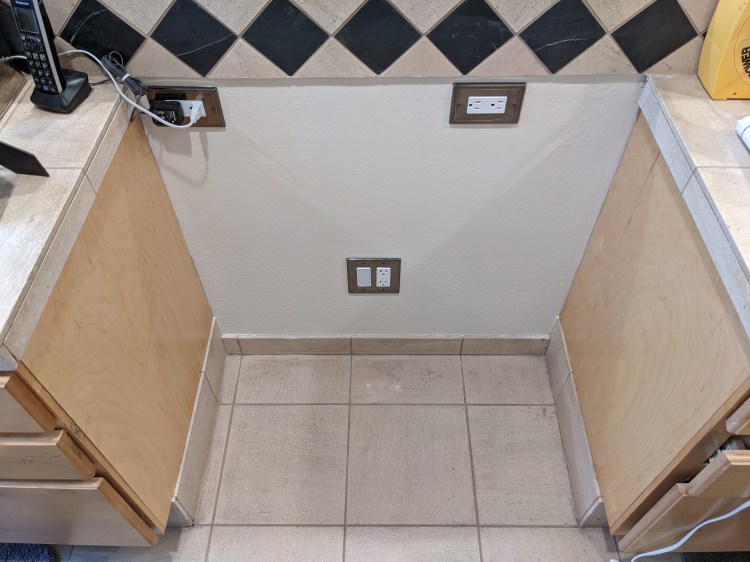 Removed drywall, added electrical outlets, and added new siding to cabinets to cover the damage.