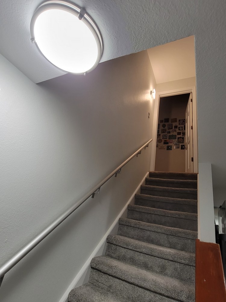 Kevin added a light at the top of the stairs leading into the basement since it was so dark on the way down. This required a very long drill bit through the stud header to reach the inner wall for wire routing, along with some fancy wiring since it’s a 3-way switch with two lights.