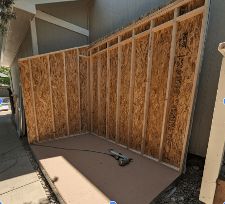 Shed construction was performed by the contractor. Kevin hung shelves and equipment hooks.